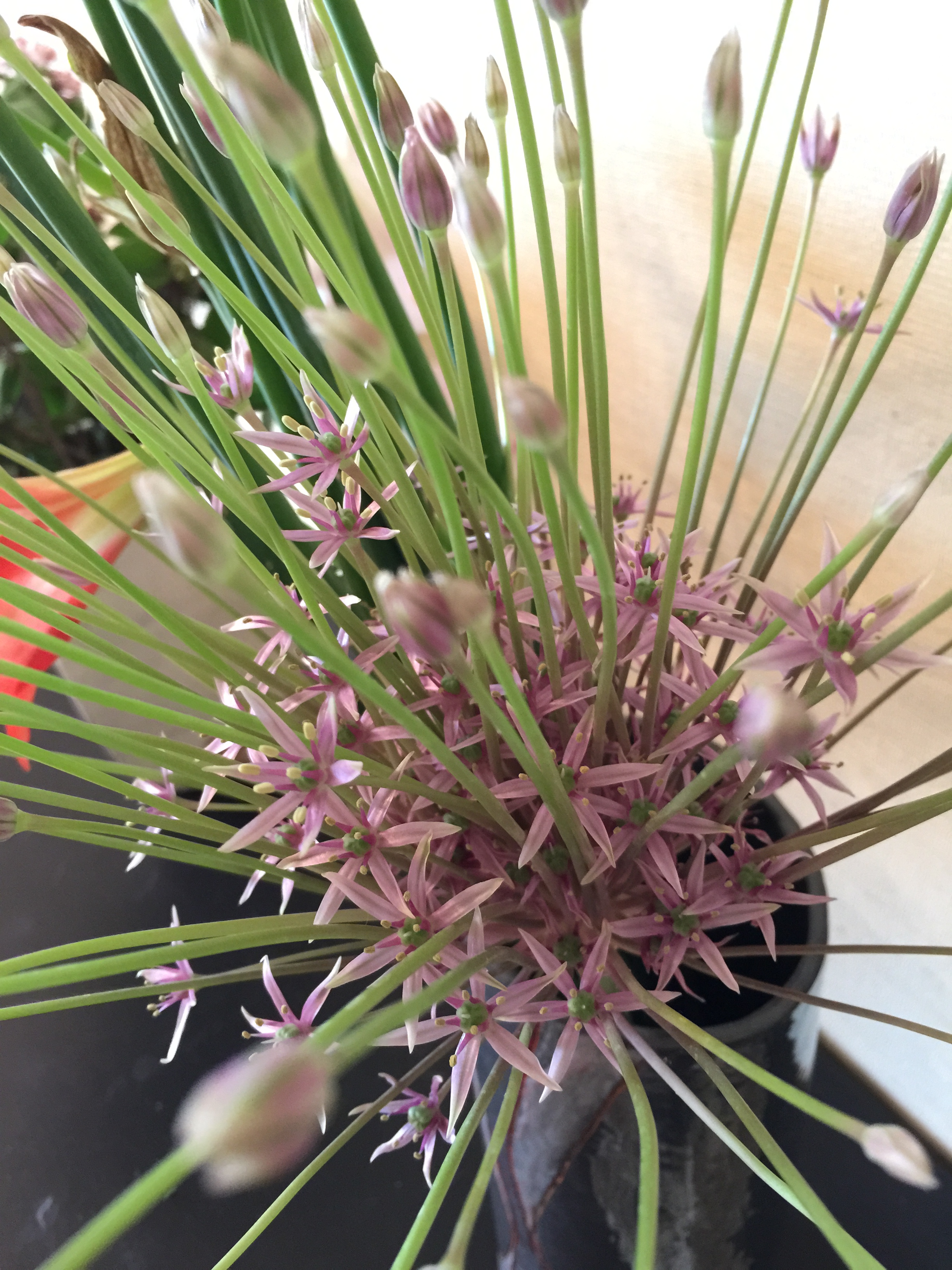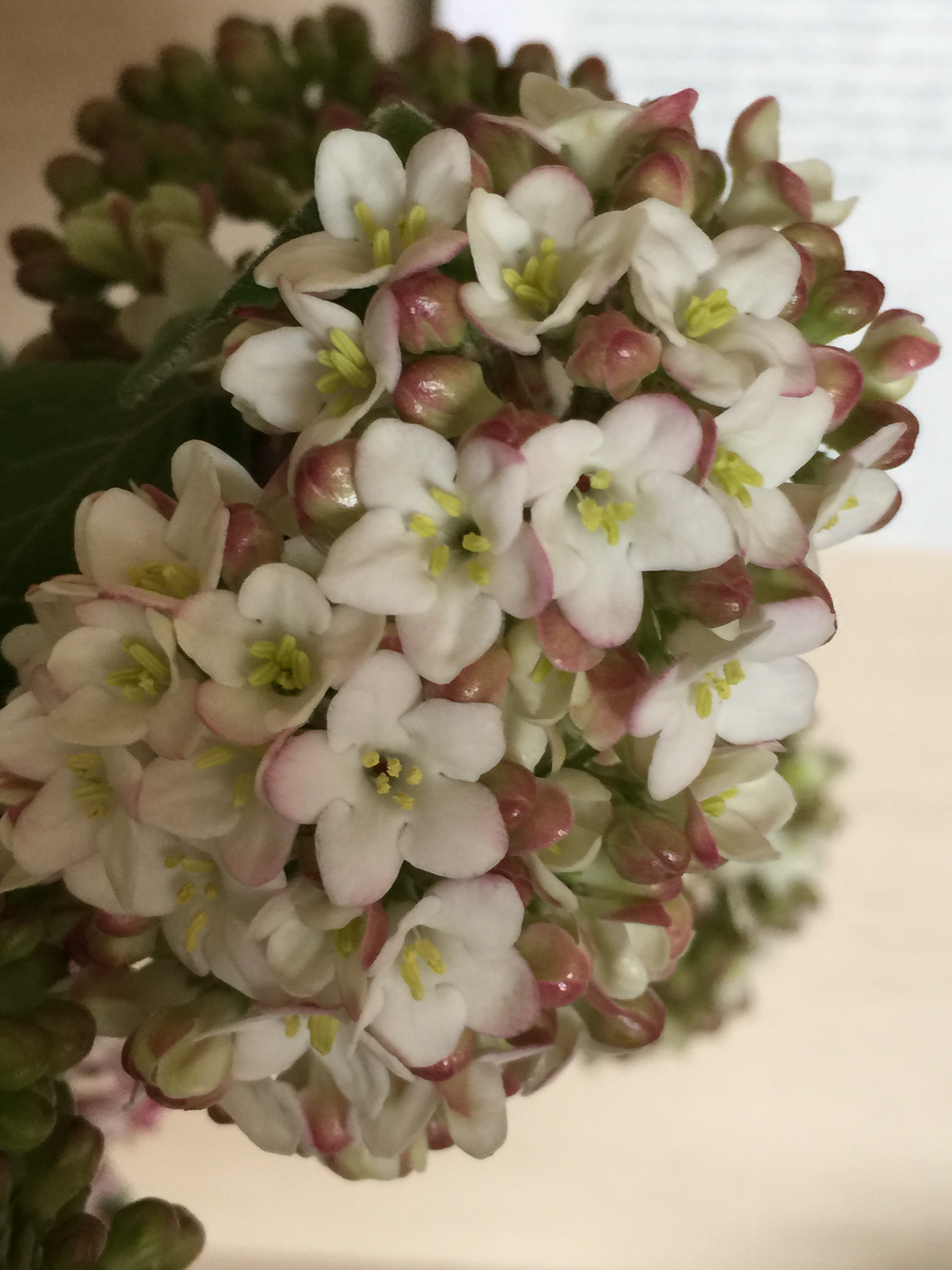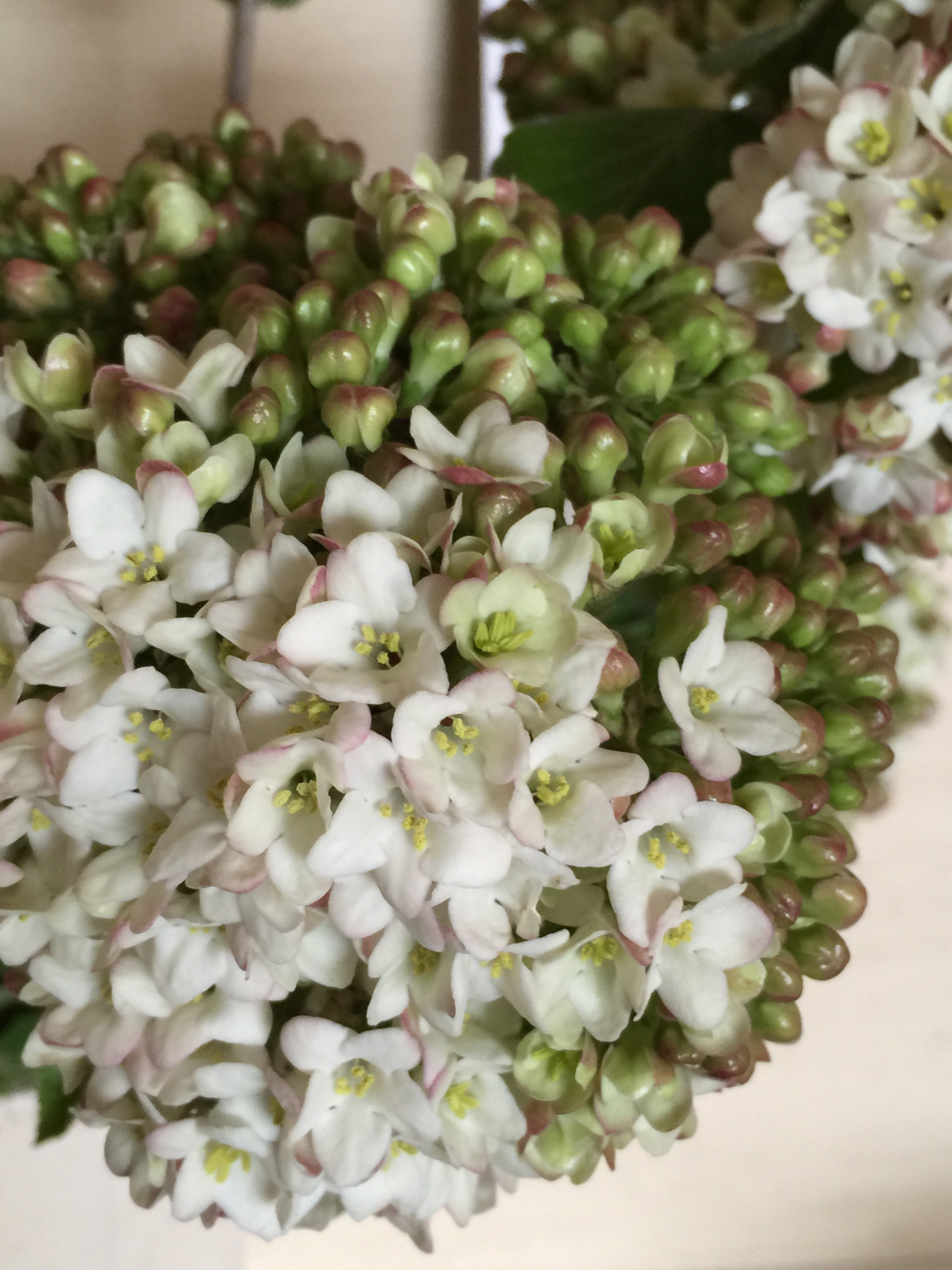 先週持って帰った中庄さんのガマズミの花が咲きました♪ ↓白 IMG_1341.JPG IMG_1340.JPG ↓ピンク IMG_1322.JPG もって帰った時にすでにピンクは満開で白はまだ蕾でした。ピンクはすぐに散ってしまいました。白は水が上がらず、花首垂れて終了かなと思いましたが、枝を割って深水に活けたら見事に咲きました♪ほのかに赤い蕾もぷりぷりで可愛い♪まんまるな手毬みたいです。 ↓そんでやっぱり好きだなぁと思うのがシュペルティ。 IMG_1342.JPG かっちょいい。今回はおまけが入っていたので1本いただけてこれも飾っていますが1本でも存在感がかなりある!でも色が優しい。かぁちゃんの作った陶器の器に活けました。 茶花と言えばの中庄さんはこの季節オダマキ、センダイハギ、芍薬など出荷してくれています。枝ぶりが繊細で無農薬栽培です。通年通していろんな草花がくるので季節が巡るのが楽しみです。