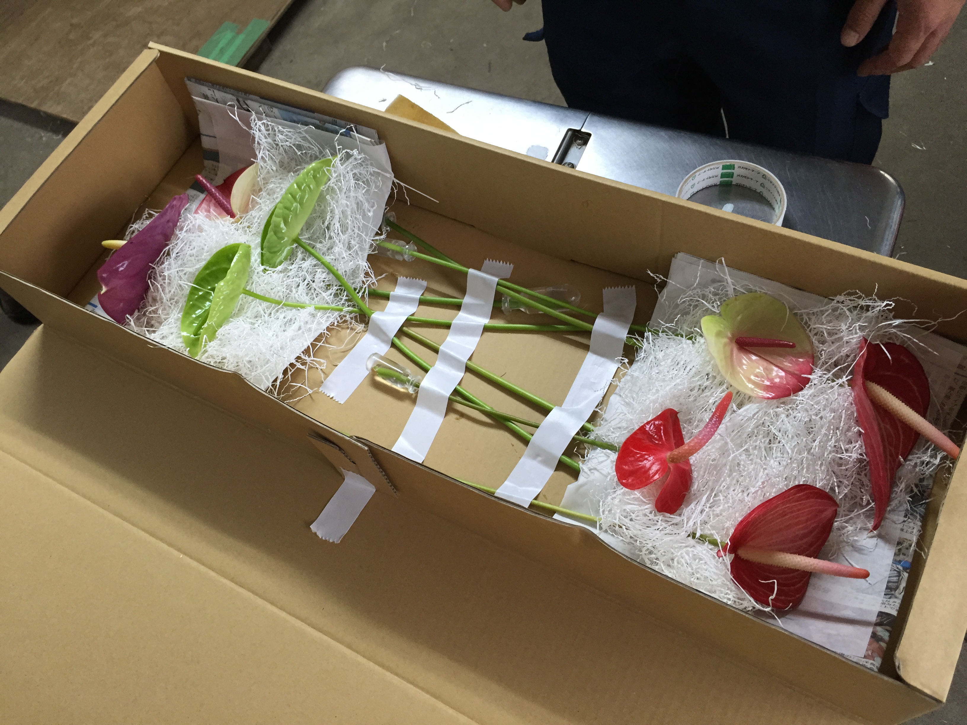 お客様には花を取り出すときに手間になってしまうかもしれないけど、数か所テープでとめさせて貰っていますとおっしゃっていました。アンスリウムは少しの衝撃で傷が付いてしまうとても繊細なお花。輸送時の横揺れ、縦揺れに配慮した箱詰めがされていました。