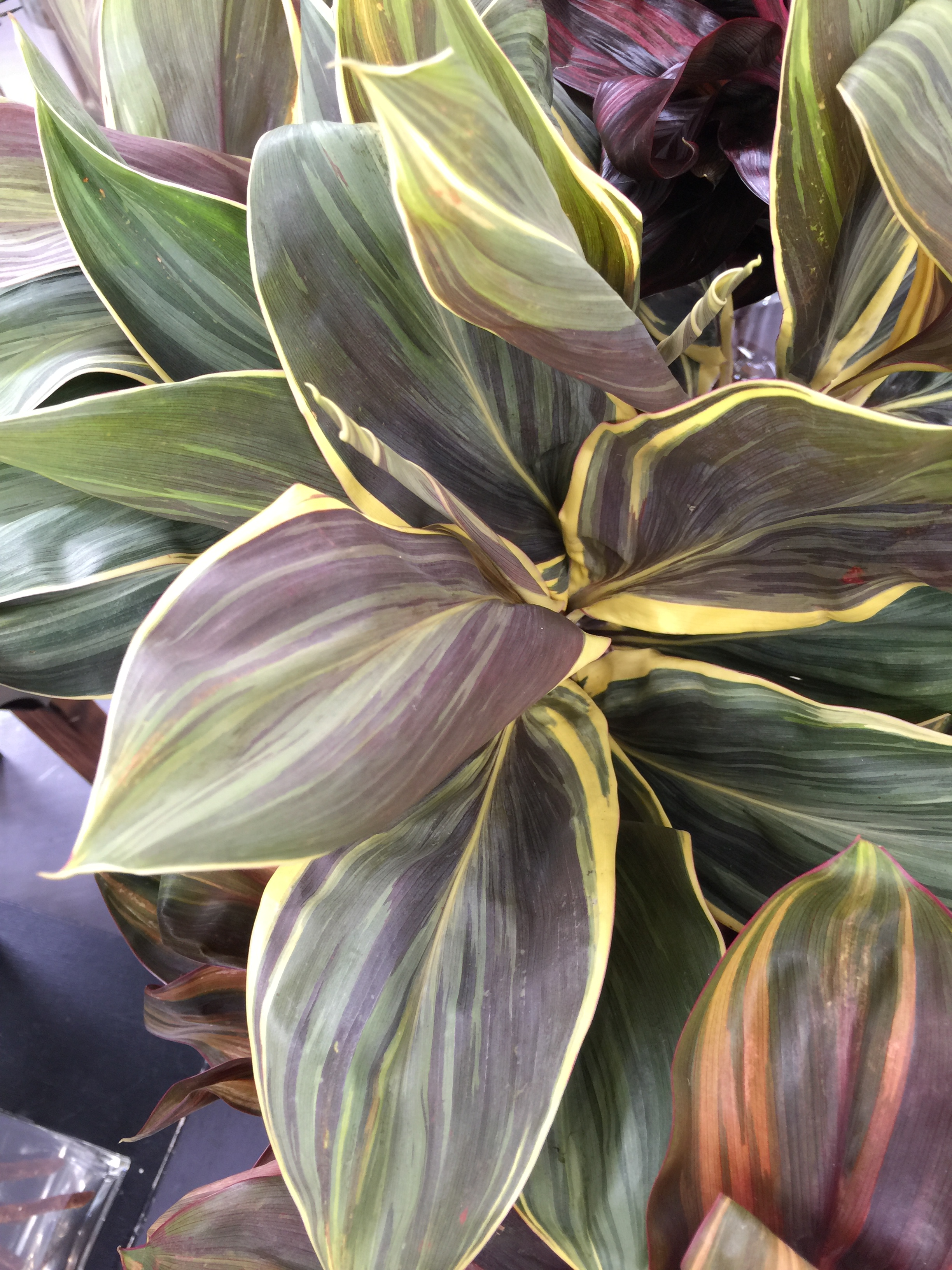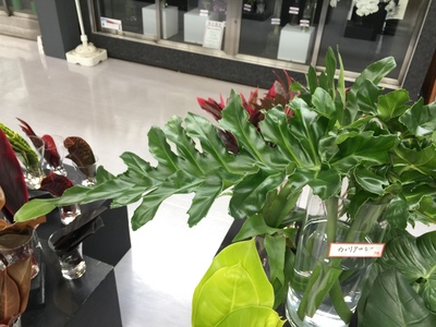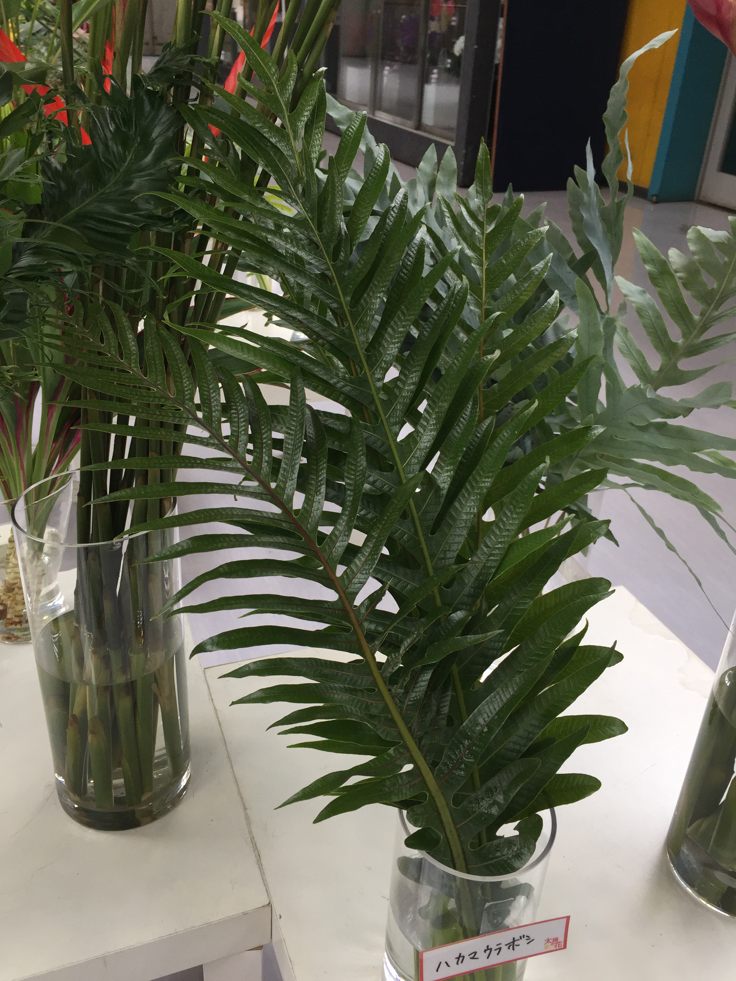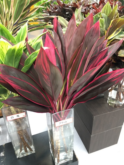 今週は沖縄トロピカルフェアです! と、張り切ってみたものの、正直今年はインパクトがない。。。 ですが!品種はいっぱいありましたよ、ドラセナ♪ 昔はドラセナの赤といえばアトム、青は白馬くらいしか流通がなかったのにこんなにもおしゃれ色がふえたかーーーとおもいました。 ↓アトム(大葉) おなじみのこれを基準に独断で大中小で表記してみます。御参考までに。 IMG_1726.JPG ↓レッドフラミンゴ(小葉)  IMG_1691.JPG 細葉のミニタイプの赤ドラです。ふちにきれいにピンクが入っています。 ↓ワインレッド(中葉) IMG_1689.JPG 写真より濃い色です。背丈はそんなに高くなくアトムなどに比べると小さめです。 ↓レッドキャニオン(大葉) IMG_1694.JPG ステムは長めで葉も大きめです。コーディラインレッドに近いです。 ↓クイーンスポット(大葉) IMG_1696.JPG カプチーノより白と黒の濃淡がはっきりしているように感じました。とてもきれいでした。 ↓レフレクサグリーン IMG_1698.JPG 発色のいい緑色で葉も固めなドラセナです。 ↓マーラ(中葉) IMG_1699.JPG 幅広の個性の強いドラセナです。 ↓パロロ(中葉) IMG_1701.JPG こちらも幅広タイプ。マットな質感で落ち着いた色味が魅力的でした。 ↓エキゾチカコンパクター(小葉) IMG_1703.JPG ツヤツヤのまさにエキゾチカなドラセナ。 ↓グリーンコンパクター(小葉) IMG_1709.JPG ブラウンが強いのがグリーンコパクター。 ↓グリーンコンパクター2(小葉) IMG_1707.JPG 「2」の方がグリーンが強いです。 ↓クラウンピンク(小葉) IMG_1711.JPG ちっちゃいコーディラインレッドってところかな。 ↓パープルコンパクター(小葉) IMG_1713.JPG これをはじめてみたときは衝撃でした。何年も前のお話ですが。 ↓キャンドルクイーン(大葉) IMG_1717.JPG アトムのように中心に行くほど色がピンクになります。 ↓レッドクイーン(大葉) IMG_1719.JPG 葉の先に行くほど蛍光ピンクが強くなります。 ↓紅光(小葉) IMG_1720.JPG ステムは70~80cmあり長めですが葉は小さめです。 ↓グリーンスマイル(中葉) IMG_1722.JPG 縁取りが白い♪ ↓薄化粧(大葉) IMG_1723.JPG 青ドラにやさしいフチピンクのドラセナです。葉も大きく長く幅広です。 ↓ジュノン(大葉) IMG_1724.JPG 細葉のミックスカラーです。 ↓ジョニークイーン(大葉) IMG_1725.JPG ピンクのさしの入った青ドラです。優しい印象が強いです。 葉物好きにはたまらないラインナップです♪ ドラセナ以外でも「さすが沖縄!」というような珍種がたくさんありました。 なかでも一番のお気に入りはこれ! ↓ハワイアンファン IMG_1688.JPG ギザ葉好きの私のドツボでした♪ ほかにもこんなものが。 ↓ムカデサボテン IMG_1673.JPG 葉から根がでてきています。 IMG_1675.JPG ↓ハカマウラボシ IMG_1678.JPG ↓ブルースター IMG_1679.JPG ↓シンゴニウム IMG_1681.JPGIMG_1682.JPG ↓ウィリアムシー IMG_1685.JPG 横に長いセロームってかんじ。 ↓ヒトツバ IMG_1686.JPG 表裏のツートンカラー。こういう葉っていけると結構かっこいいんです。 一部抜粋でご紹介させていただきましたが、葉ものだけでもうきうきしちゃう位の品種量です♪ 葉物だけでも素敵アレンジが作れちゃいそうです!こんな感じで今週一週間、トロピカルフェア開催中です!ぜひぜひ蒸し暑い季節だからこそ葉物を上手に使ってみてください。