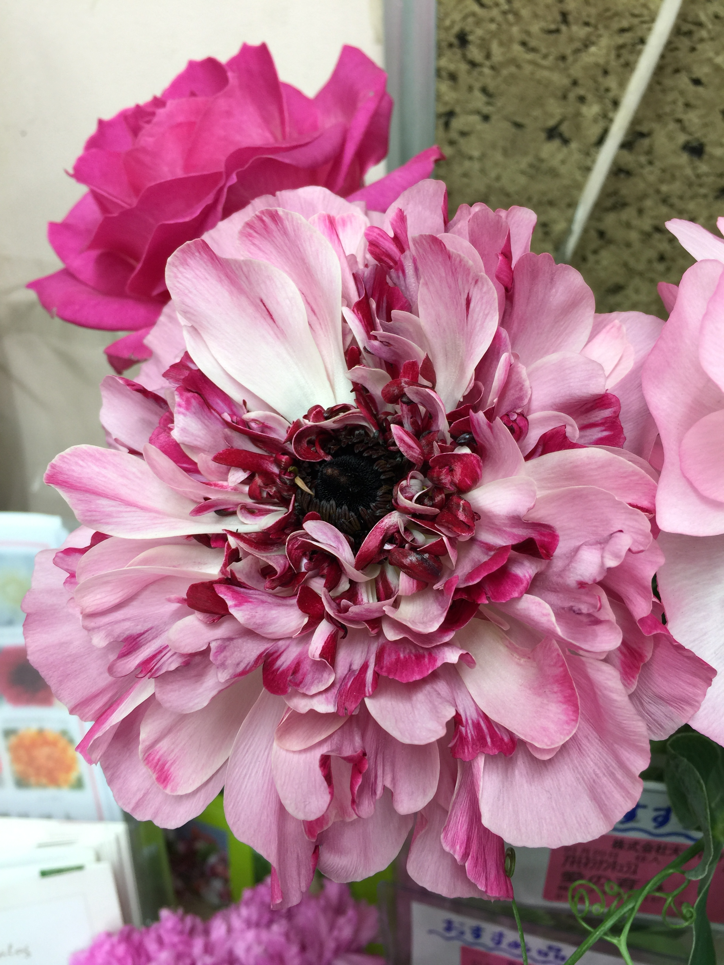 今年も大人気です、変わり咲きのラナンキュラス♪ PONPONシリーズのオーロラです。 IMG_8326.JPG このクシュっとした感じと色の入り方がたまらない逸品です。 昨年、ラナンキュラスの生産者さんのお宅にお邪魔した時に聞いた話ですが、このPONPONシリーズはとにかく丈が短い。なので、時期によってはあまり長いもののご注文は対応が難しい場合があるのでお気をつけください。昨年もある程度の長さが出てきたのは2月中旬以降でした。 そして今年もきれいです、シャルロット! IMG_4341.JPG 大輪でラナンらしくないラナン。主役をはれる存在感の持ち主です。 シャルロットはオレンジや濃いピンクもあります。 これらの色は超希少品種!出てたら即買いですよぉ!写真は昨年のもの。私は7時出勤なので今年はまだ見ていません・・・。早い時間にはあったらしい。 IMG_4505.JPGIMG_4508.JPG ひらひら美しい。特に透明感のあるオレンジは昨年は問い合わせ多数でした。 こちらも特徴的なラナン、シストロン。 IMG_4513.JPG 発色のいいグリーンと赤が目を引きます。とても元気の出るカラーです♪ でもやっぱり落ち着くのはコロンとした普通咲のものかも。 今の季節は宮崎、長野、香川、長崎などのラナンキュラスが市場を彩ってくれていますが、私の家のご近所生産者さん、大野重雄さんもラナンキュラスそ出荷されています。千葉県なので出荷本番はこれからです。 この道をチャリで鼻歌うたいながら進んむと・・・ IMG_5179.JPG ラナンでいっぱいのハウスにつくの。 IMG_4623.JPG でも実は、いつも私がお邪魔するのは昼間。出荷の為に花が切られた後だったりするのであまり咲いているものはみあたらない(苦笑)。 これらのハウス写真、盗撮じゃないっすよ。大野さんははずがしがってご自身の写真は撮らせてくれないんです。「俺なんか撮んなくていいよ、花みてくれれば。」と。前へ出るべきはお花であって俺じゃないというのが大野さん。 IMG_4637.JPG いや~たまらんわい。 IMG_5218.JPG たまらんわい。 その大野さんが育てたラナンキュラスはいつも我が家を彩ってくれます。 IMG_5211.JPG 花のある空間、枯れかけた心が潤いますなぁ。