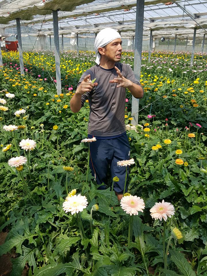 昨日今日と30℃超えらしいじゃないですか! 夏日が続くと敬遠したくなるお花筆頭がガーベラではないでしょうか。 理由はいわなくてもお花屋さんが一番実感されていることでしょう。水がにごりやすい、茎が腐りやすい、花がかびやすいetc… ですが、そんな常識を覆すべく、ガーベラ生産者さんはがんばっております! ここのところ茎が硬くていいなぁとおもっているのがこちらの林園芸さんのガーベラです♪金曜日にためしにと林さんのベビードールを買って帰りました。が!今日出勤してびっくり!林園芸のサンプルが事務所にわんさか。 林さん行くなら教えてよ~と声を大にしていいたいところですがそれはおいといて、産地にいった同僚からのまた聞きですがご紹介させていただきます! IMG_1025.JPG 林園芸さんは千葉県旭町の海が近くのハウス3棟で土耕栽培にてガーベラを栽培されています。太平洋から吹く潮風はガーベラに程よいミネラルを与えてくれているようです。 ↓こちらが2代目の林さん。 現在43歳既婚、PTA会長も勤めていらっしゃいます♪ 18557330_663417123844714_2898098321849029028_n.jpg 単位は1ケース50本入り、大輪は30本入りで横箱にて出荷されています。 こちらがガーベラのハウス! 18581663_663417207178039_6779618579050299158_n.jpg 葉が立っています!とっても元気なガーベラたちです♪ 18527927_663418530511240_7374967863900261755_n.jpg なんといってもこだわりは「土耕」!茎が硬く腐りづらい持ちのいいガーベラに育ちます。そしてもうひとつのこだわりは、採花のさい、茎を切らずに引っこ抜くことです。 IMG_1029.JPG この茎の下の色が変わっている部分を切らないことがガーベラを長く楽しむコツです!仕方なく切るときにはここを残すようにうっすらと切ってくださいね♪ そして、2年ごとに米糖と水で30時間かけて土壌を消毒します。このとき、地温は50℃になるそうです! 18528089_663433483843078_5169171345087810667_n.jpg 分荷場の様子。 18582573_1894733390793763_3947800822935452417_n.jpg 輸送時に花が傷がつかないように一つ一つ機械を使わずに手作業でキャップをつけます。 ですが、キャップは花にとってとてもストレスを与えるもの。なので、お水につけるときにはキャップはすぐにはずしてくださいね。これが長くついたままだと、ガーベラは「やっと開放された~!!」と花びらが反り返ってしまうことが良くあります。品種の特性にで反り返りやすい品種などもありますが、大抵の花びらがそりかえりの原因はこれでもあります。できたら、お花がお店に着いたらこのキャップをなるはやではずしてあげてくださいね♪ さて。ここからは品種紹介です!試作も含めどっちゃりご紹介していきます♪ ↓トレーシー IMG_0987.JPG ↓コメット IMG_0988.JPG :見事なポンポン咲き♪ここまで丸くないとポンポンとは言えない!というのが林さん。 IMG_0995.JPG ↓テラリブラ IMG_0996.JPG ↓ビーバー IMG_0997.JPG ↓ガーラ IMG_0992.JPG ↓試作イエローフルダブル IMG_1002.JPG ↓マルビーナ IMG_1021.JPG ↓マノン(大輪) IMG_1003.JPG ↓試作ピンクその1 IMG_1022.JPG ↓試作ホワイト(芯白) IMG_0998.JPG ↓ソープ(大輪) IMG_1001.JPG ↓試作ピンクその2 IMG_1007.JPG ↓ビビット(山吹色芯グリーンっぽい白です) IMG_1009.JPG ↓ケンタッキー(オレンジ芯白) IMG_1010.JPG ↓キムシー IMG_1011.JPG ↓ブライダルキムシー IMG_1020.JPG ↓ひよこ IMG_1012.JPG ↓シトラ IMG_1016.JPG ↓試作赤ピンク(芯黒) IMG_1015.JPG ↓ベビードール IMG_1019.JPG ↓試作ピンク芯黒 IMG_1014.JPG ↓試作ライトライトピンク芯茶 IMG_1024.JPG ガーベラは夏場はひまわりに主役の場をとられがちなお花かもしれませんが、特性を知って管理すれば夏場でもとても持ちのいいお花です!色とりどり、形もさまざまあり、どんな用途にも対応できる万能のお花で、全国各地から通年を通して出荷されています。 色形で選ぶ、単価で選ぶ、品質で選ぶ。 理由はそれぞれあるかとおもいます。その中でも御自分に合ったベストの産地さんのガーベラを見つけていただければとおもいます!