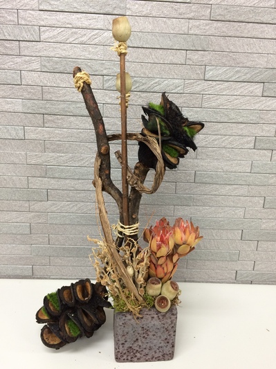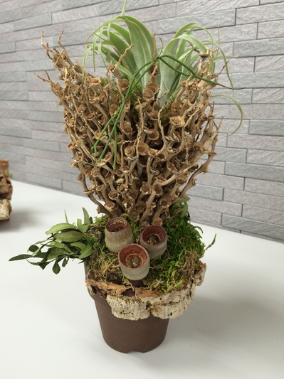 今日はドライフラワーアレンジ初日でした! レン氏がデモンストレーションしてくれて大盛況。初日にもかかわらず売切れてしまったアイテムが結構ありました。 IMG_6544.JPG 今日は、レン氏が作ってくれたアレンジをご紹介します♪ アレンジの参考にしてください! IMG_6545.JPGIMG_6546.JPG ↑使用ドライ ・プテリゴタ 板にプテリゴタをねじでとめてしまっているのでひっくりかえりません。 あまりお水を必要としない多肉植物等の器に。プテリゴタはニスであらかじめカバーリングしておくと腐りづらくなります。 IMG_6547.JPGIMG_6548.JPG ↑使用ドライ:ヤシの葉 一回お水で約半日ふやかして形を形成しています。形を作ったら紐等で固定し乾燥させます。お天気のいい日であれば1日くらいで形が出来上がります。 IMG_6540.JPGIMG_6541.JPG ↑使用ドライ ・スペシオザホワイト ・ホワイトウッド ・ハケア ・ユーカリの実 ホワイトウッドを産後に見立てて。夏らしいアレンジの出来上がりです。 IMG_6542.JPGIMG_6543.JPG ↑使用ドライ ・アーティチョーク(3L) ・リューカデンドロン ・ユーカリの実 ・ドライコーン 生花はHBチースとルピナスの実(枝豆みたいなの)などドライフラワーになるものを選んで使用しています。生花をドライにする場合、入荷後、水にはつけないほうがいいとのこと。水につけちゃうとさらに水分をすってしまうのできれいにドライになりづらいのだそうです。 IMG_6552.JPGIMG_6555.JPG ↑使用ドライ ・ヤシの葉 ・アーティチョーク(M) ・リューカデンドロン ・ユーカリの実 ・流木 ・スペシオザブラック どのように使っていいかわからない大きなヤシの葉ですが。このように立てて使うなんて発想にびっくりですがとってもおしゃれ♪倒れないようにセメントで固定しています。 IMG_6576.JPGIMG_6577.JPG ↑使用ドライ ・ブラウンウッド 土台はセメントで固定しています。 IMG_6572.JPG 丸い輪にブラウンウッドをワイヤーで固定しているだけです。それを土台から出ている3本の枝に絡めて固定しています。 IMG_6558.JPGIMG_6560.JPG ↑使用ドライ ・アーティチョーク ・リュウカデンドロン ・ユーカリの実 ・流木 ・ドライコーン IMG_6549.JPGIMG_6551.JPG ↑使用ドライ ・ホワイトウッド こちらは花束です。 ホワイトウッドに棒をくっつけて花材のように使用しています。 IMG_6573.JPGIMG_6575.JPG ↑使用ドライ ・スペシオザブラック ・リューカデンドロン ・ヤシの実 ・ユーカリの実 大きなヤシの実も切り分けてポイント使い♪ IMG_6580.JPG ↑使用ドライ ・コルク ・リュウカデンドロン ・流木 鉢物入れちゃいました♪コルクも切り分けて高低差を出して使っています。 IMG_6571.JPG ↑使用ドライ ・コルク コルクとなべ敷きを木工用ボンドでくっつけて、コルクの中にペットボトルに水入れて簡単おしゃれなベースの出来上がりです♪ IMG_6583.JPGIMG_6585.JPG ↑使用ドライ ・アーティチョーク ・ハケア ・ユーカリの実 ・ウニ(貝殻) IMG_6587.JPGIMG_6588.JPGIMG_6590.JPG ↑使用ドライ ・ヤシの実(切り分けて使用) ・リュウカデンドロン ・ユーカリの実 ・ハケア ・コルク(切り分けて使用) これも大きなヤシの実を切りわけて使用しています。個性的なオブジェの出来上がりです!エアープランツはのせてるだけなのでお水もあげやすいです。 IMG_6591.JPGIMG_6592.JPG ↑使用ドライ ・コルク ・ドライコーン コルクをたてに真っ二つにして器にしました。ここにミニ観葉や多肉植物を寄植えしてもきっと可愛いとおもいました。 IMG_6597.JPGIMG_6603.JPG ↑使用ドライ ・ブラウンウッド ・ハケア ・ユーカリの実 ・ウニ(貝殻) 壁掛けです。 木の板にオアシスを固定しそこにドライ等ワイヤーやグルーで貼り付けています。 IMG_6604.JPGIMG_6607.JPG ↑使用ドライ ・ホワイトウッド ・ユーカリの実 ・ハケア ・ドライコーン こちらも壁掛けの時計。ドライフラワーは手入れ不要なので壁掛けにはぴったりですね。 板に時計を固定させ、時計の周りにリース状オアシスを貼り付け、そこにドライフラワーをさしたりくっつけたりしています。 他のアレンジを作ったときにでてしまったホワイトウッドのかけらなどを時計の周りに飾りました。無駄にすることなく、かつおしゃれ!エアープランツとの相性も抜群です。 エアープランツはお水が必要なので、時計からはずせるようにしています。ドライがかびちゃわないように! とりあえず一部ですがこんな感じでたくさん作ってくれました!デモンストレーションは今日限りですが、本日作ってくれた作品は今週一杯は展示してありますのでご覧ください!また、フェアも今週一杯継続して行っています。ぜひぜひお立ち寄りいただければとおもいます♪