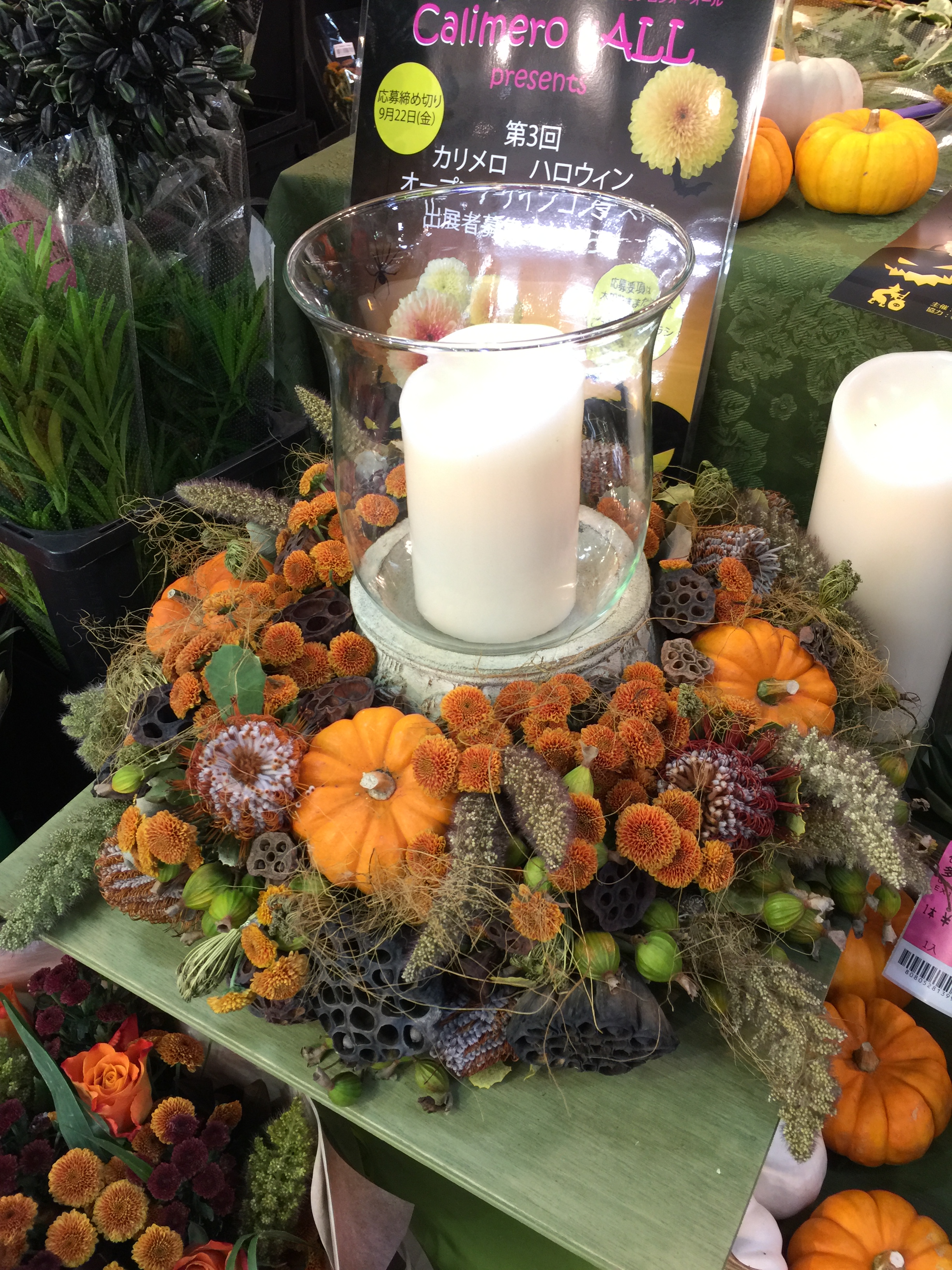今日は10月に大田市場で開催されるカリメロコンテストの告知もかねて弊社店舗前でカリメロを使ったデモンストレーションが行われました。 本日デモンストレーションをしてくれたのはアジアパシフィックカリメロカップにて日本代表で出場し見事優勝した松島理恵子さん。 いつも可愛い笑顔でおはようと声を掛けてくれる松島さんは私たちの心のオアシス的存在。そんな松島さんがカリメロにたくさんの魔法をかけてくれました~♪ IMG_2649.JPG カメラを向けられるととたんに笑顔が固まってしまう松島さん(苦笑)。パンプキンカラーのドレスがとても可愛らしい♪ IMG_2655.JPG 松島さんの作ってくれたブーケたち。 IMG_2657.JPG カリメロストーンレッド、カリメロスノー使用。 クラシカルで大人カラーのブーケ。バックが暗いのでとてもわかりづらいですがクエルカスのブラックリーフも使われています。それがコウモリのようにもみえて、ドラキュラからのプレゼントされそうなかっこいいブーケでした! IMG_2665.JPGIMG_2667.JPG カリメロオレンジ、カリメロストーンレッド使用。 オータムカラーのブーケです。少し茶色がかった粟をあわせて実りの秋を演出。ルテウスやクロコスミアなど秋の草花がいっぱい♪ IMG_2660.JPG カリメロスノー使用 ホワイトグリーンのみのカラーでもハロウィン♪超豪華~ため息しか出てきません。 IMG_2654.JPGIMG_2663.JPG カリメロオレンジ使用。 ハロウィンのキャンドルスタンドです。ドライフラワー盛りだくさん♪そんな中でもカリメロの存在感は抜群。でも他の花材と喧嘩しないところがカリメロの魅力のひとつ。 松島さんは昨年大田市場で行われた年2回あるカリメロコンテストで優勝し、日本代表としてベトナムで開催されたアジアパシフィック大会に出場されました。 次にこの栄冠を手にするのは誰!?コンテスト出展者応募は本日より9/22(金)まで弊社大森花卉と大田花卉で受け付けています。コンテストで使用するカリメロは主催者であるグリーンウィングスジャパンさんが提供してくれます。 たくさんの皆様の応募お待ちしています♪