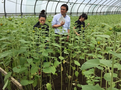 「ヤマキ」というのは昔からの屋号だそうで、作っている方は山田さんとおっしゃいます。2代目が以前弊社で研修をしていたこともあり顔なじみ。まだ20代の青年ですが、ヒマワリに対するアツイ思いはしっかりともって生産に取り組んでいらっしゃいました。